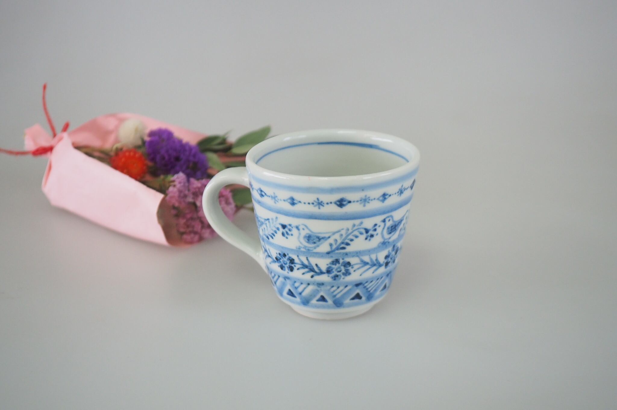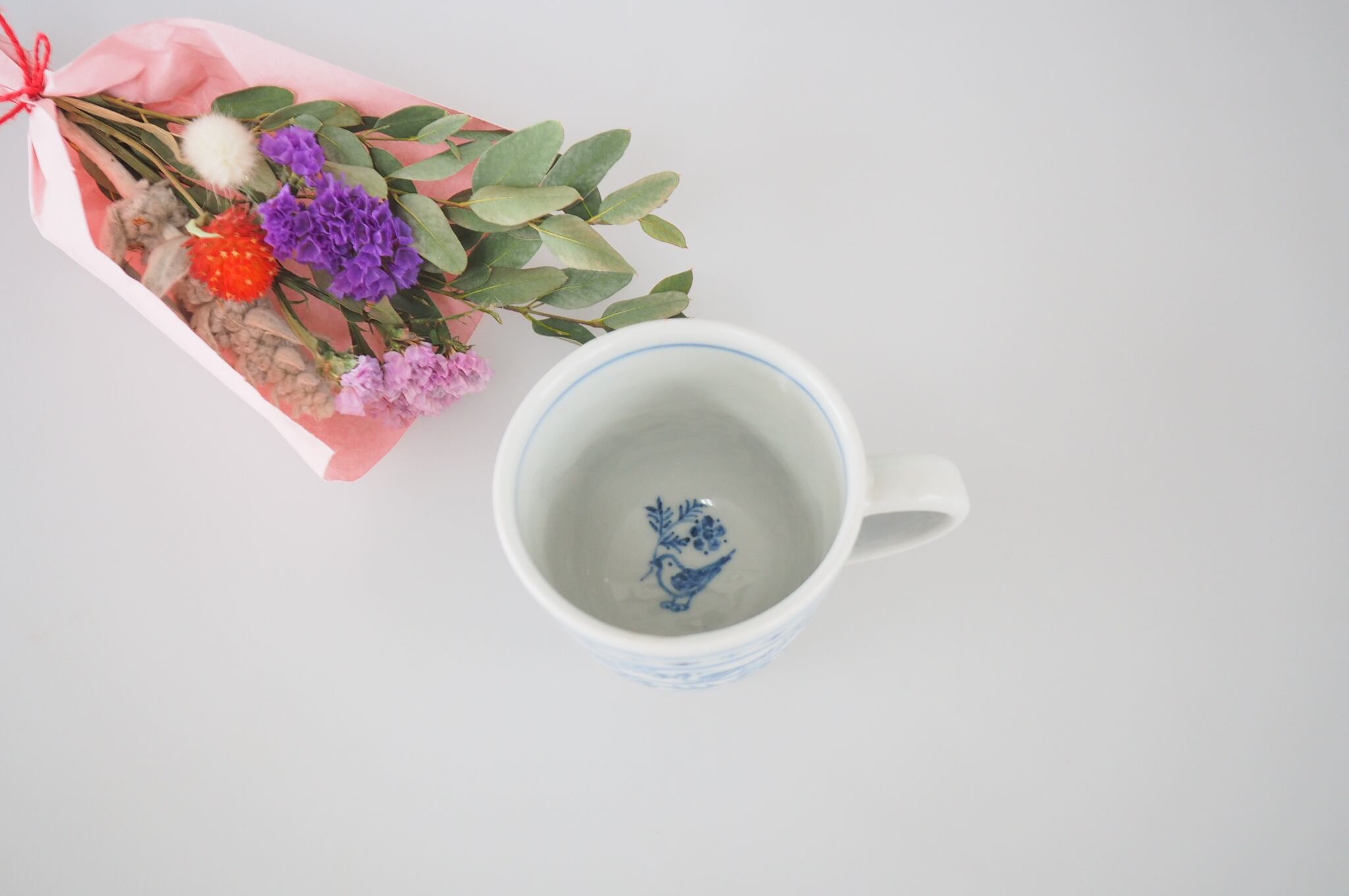こちらは、花と鳥のマグカップにミニブーケが付いたセットです。